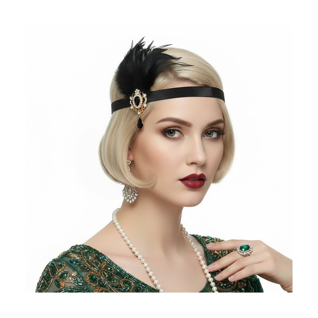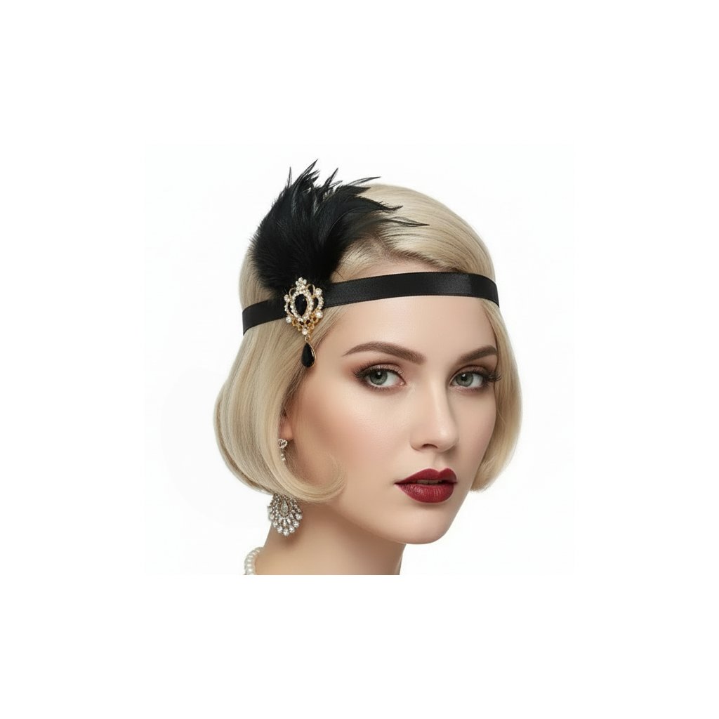 Vytvořte si autentický look ve stylu 20. let během pár vteřin. Tato výrazná čelenka s elegantním peřím a zdobeným medailonkem dodá každému outfitu nádech éry flapper a art deco.