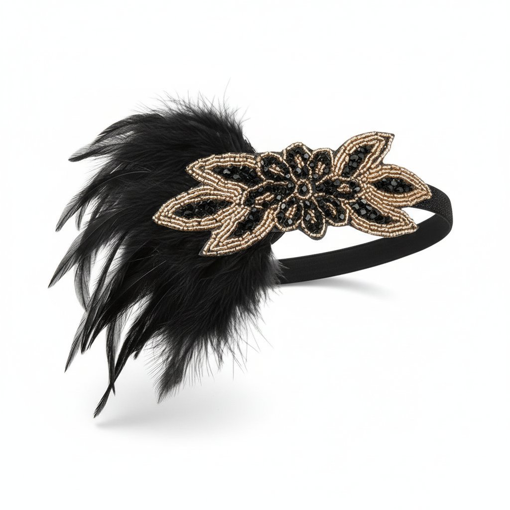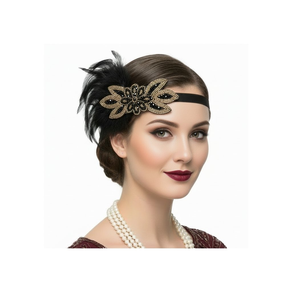 Doplňte svůj párty kostým ve stylu 20. let o detail, který udělá největší efekt. Tato elegantní čelenka s výrazným peřím a bohatým zdobením z drobných korálků okamžitě navodí atmosféru flapper éry a art deco elegance.