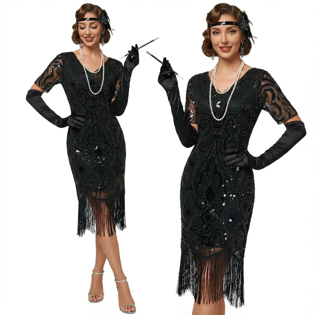 Přeneste se do zlaté éry jazzu a nespoutaných večírků. Tyto úchvatné černé šaty s třásněmi ve flapper stylu jsou dokonalou interpretací módy 20. a 30. let.