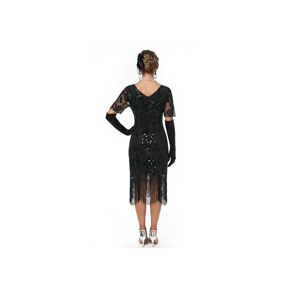 Přeneste se do zlaté éry jazzu a nespoutaných večírků. Tyto úchvatné černé šaty s třásněmi ve flapper stylu jsou dokonalou interpretací módy 20. a 30. let.