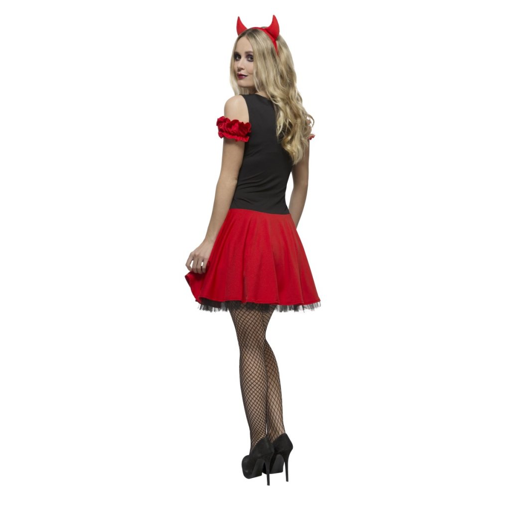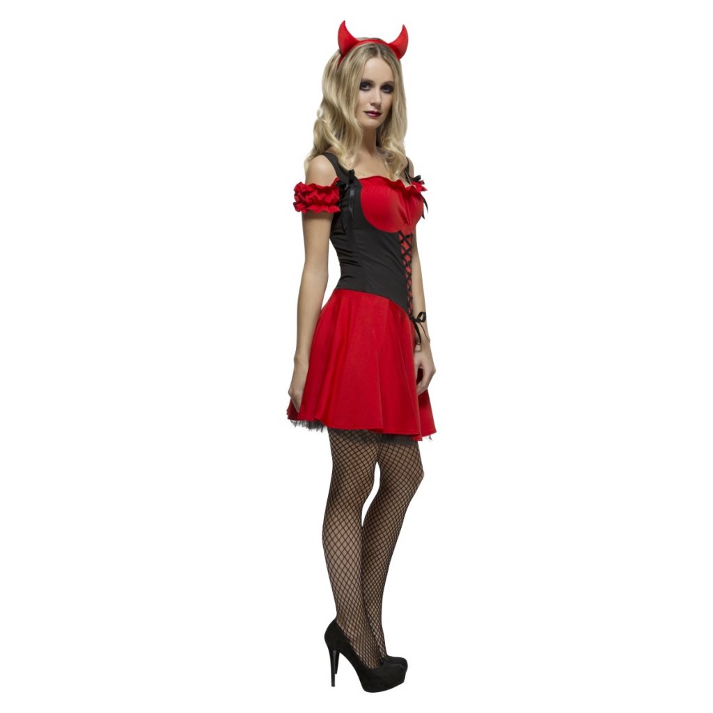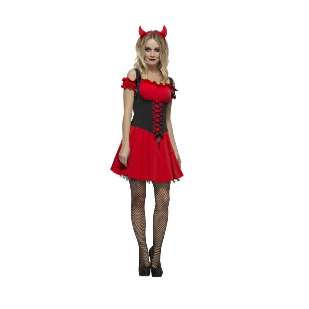 Šaty mají vyzývavou rudou barvu a střih spadených ramen s volány. Zároveň je zdobí černá sexy vesta na šněrování, která začíná pod prsy a končí v pase. Nezbedný dojem pak navodí červená čelenka s růžky čertice. Ke kostýmu se hodí černé síťované silonky, které jen podtrhnou sexy styl.