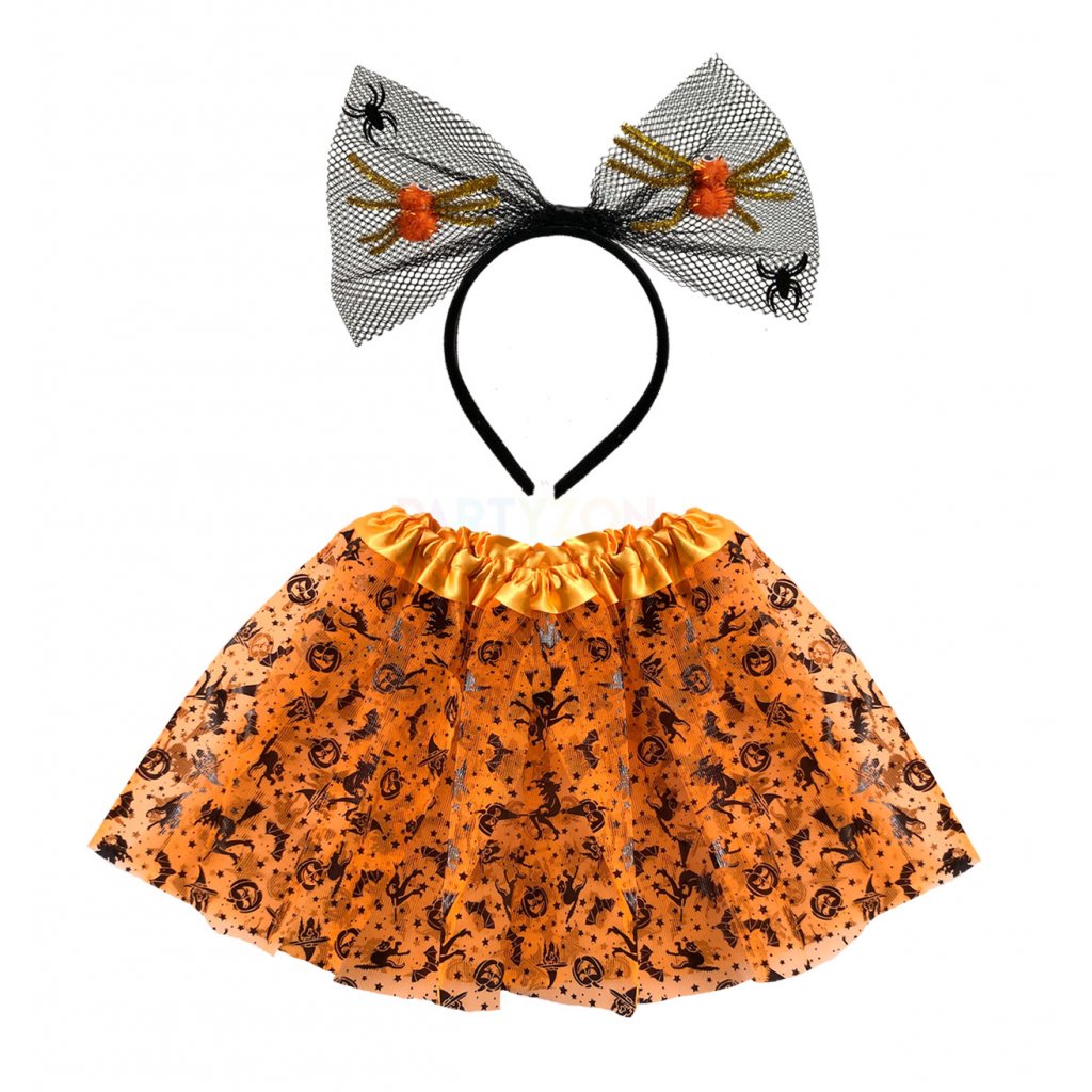 Tylová tutu sukně a čelenka s mašlí pro slečny zdobí halloweenské motivy. Sada je vhodná jako doplněk k Halloween kostýmu.