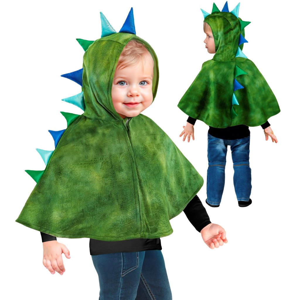 Dětské pončo dinosaura je jednoduchý a nepřehlédnutelný kostým na dětský karneval nebo Halloween. Oceníte to, že ho lze snadno obléknout i přes bundu, takže ho využijete pro své dítě i na večerní halloweenský průvod.
