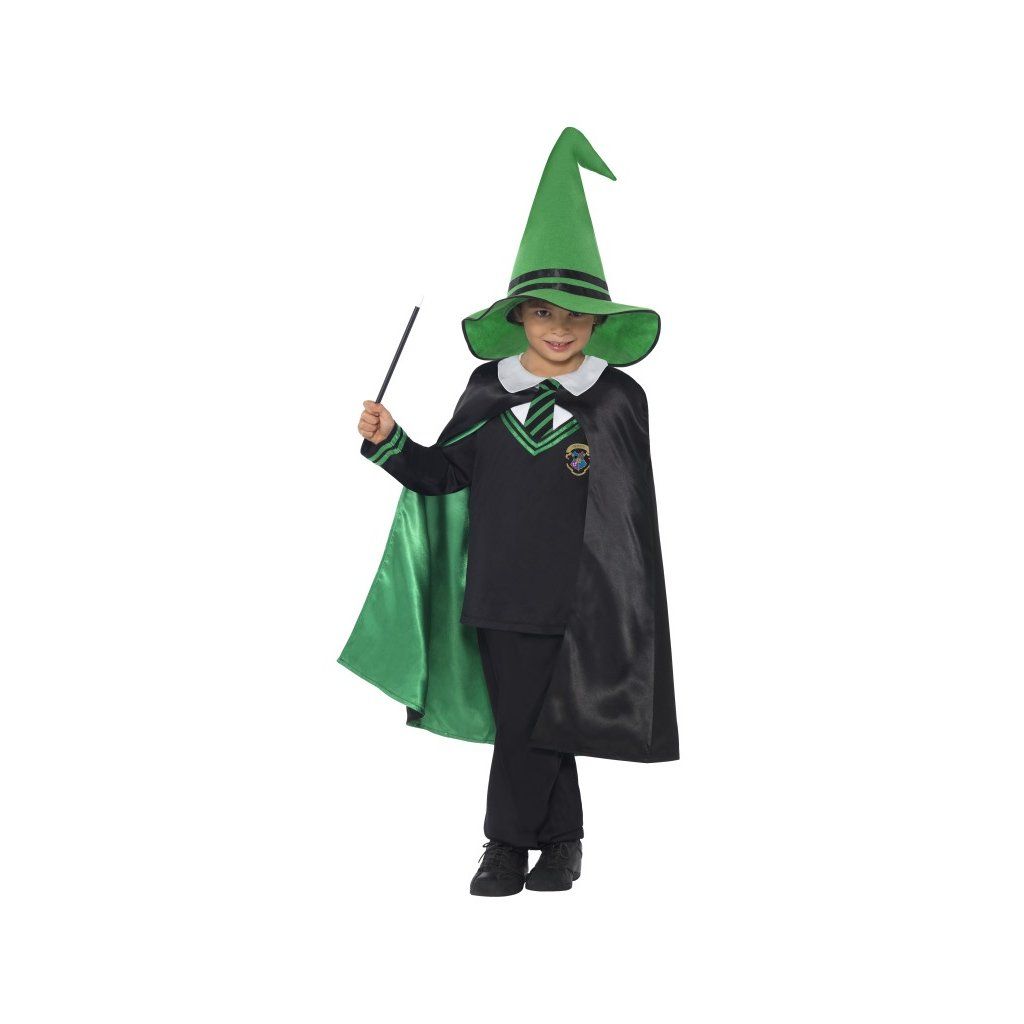 V černozeleném plášti s kapucí, lehkém svetříku se znakem koleje a zeleném klobouku může váš chlapec čekat na sovu s dopisem, ale také vyrazit na pálení čarodějnic nebo na karneval či maškarní.