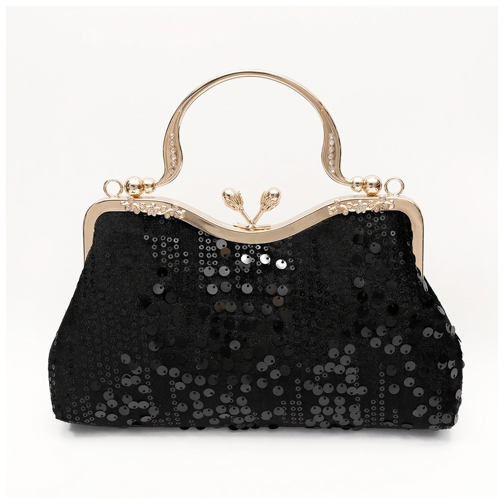 Černé třpytivé flitry v kombinaci se zlatým kovovým rámem působí nadčasově a zároveň skvěle ladí k retro stylu – ideální volba na plesy, slavnostní večery i tematické Gatsby či 20. léta party.