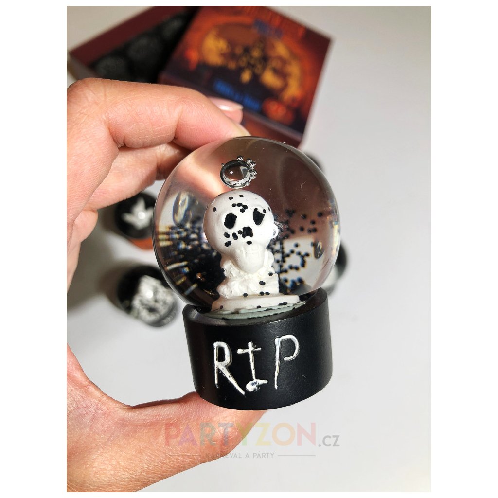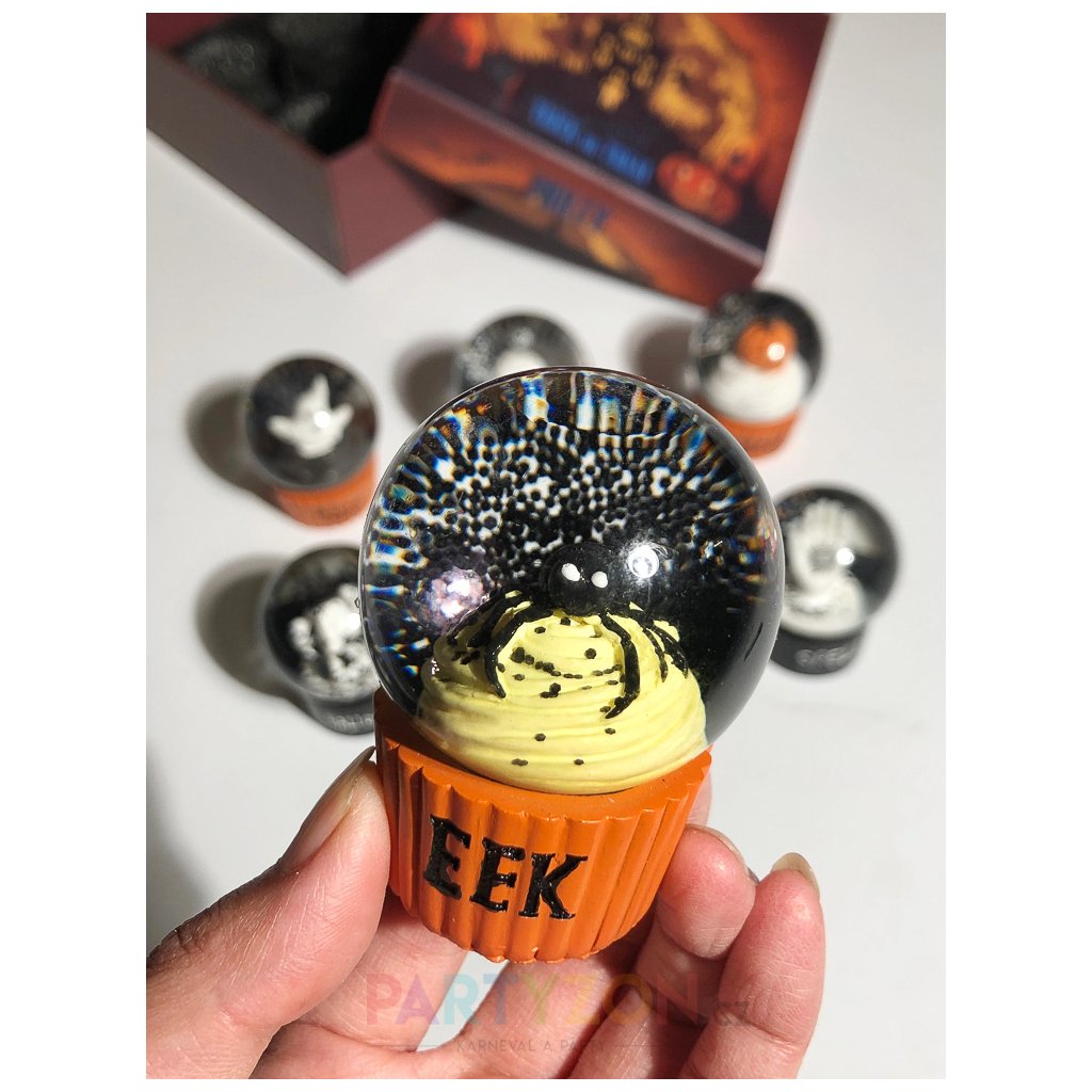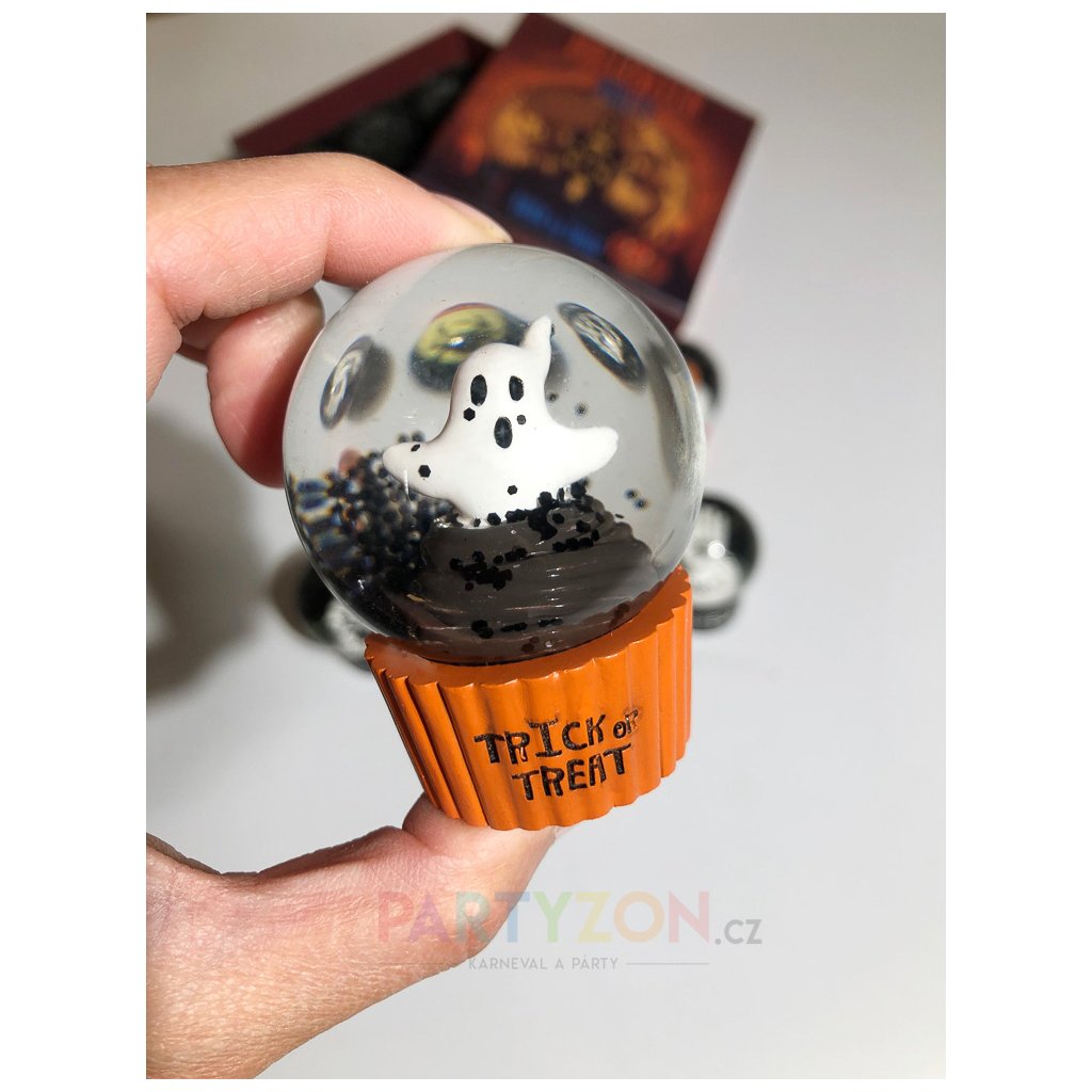 Roztomilá Halloween dekorace na stůl v podobě těžítka ve tvaru skleněné koule. Uvnitř koule jsou např. motivy dýně, ducha, pavouka, lebky a další.