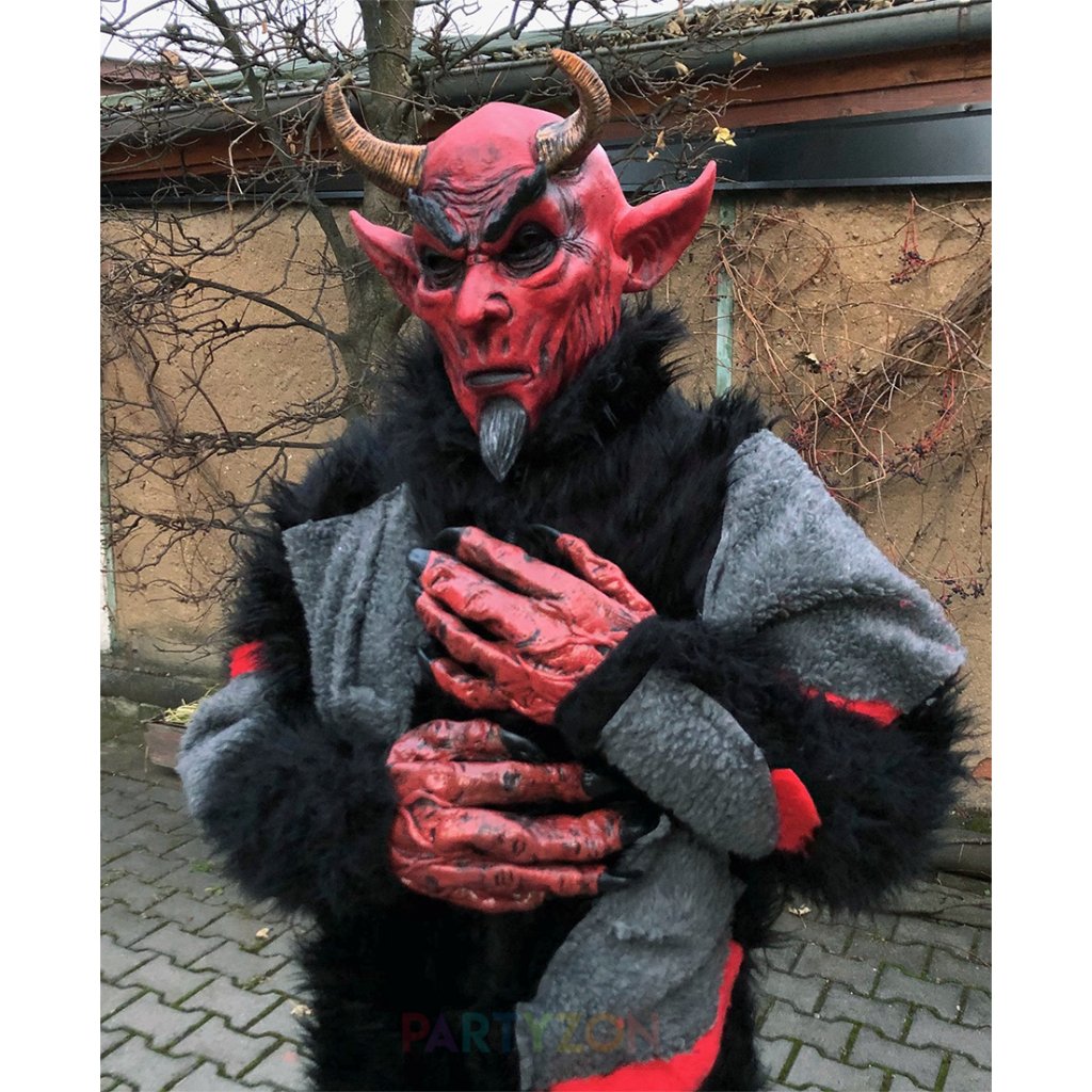 Černý kožich s šedo-červenými záplatami působí sám o sobě dost děsivě, ale doplněný o rudou masku čerta s rohy a o rukavice imitující masité tlapy s dlouhými drápy má potenciál nejednomu hříšníkovi způsobit na Mikuláše infarkt a přesvědčit ho, aby už do konce života sekal latinu. Díky teplému materiálu se navíc nemusíte obávat, že byste si v mrazivém počasí uhnali rýmičku.