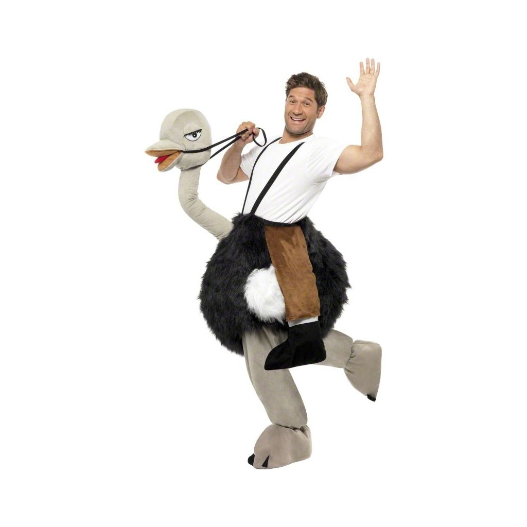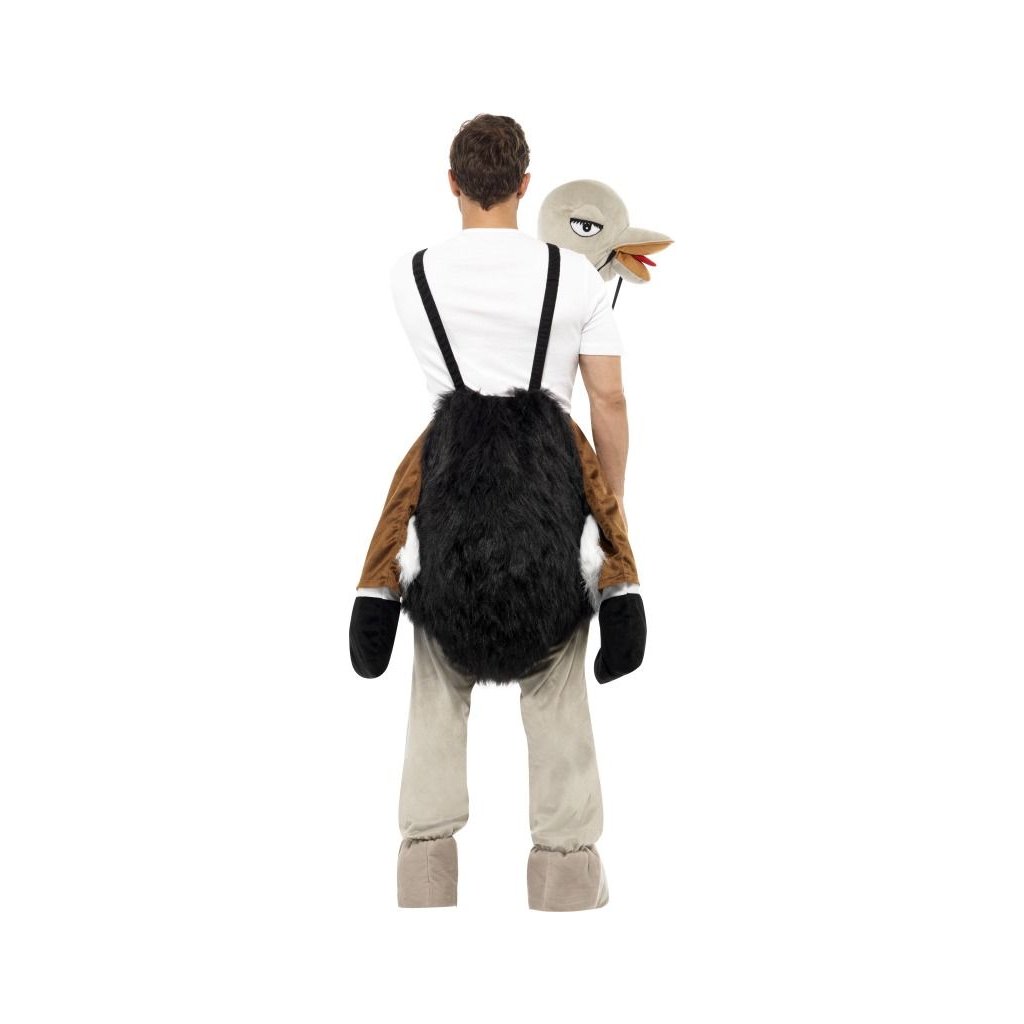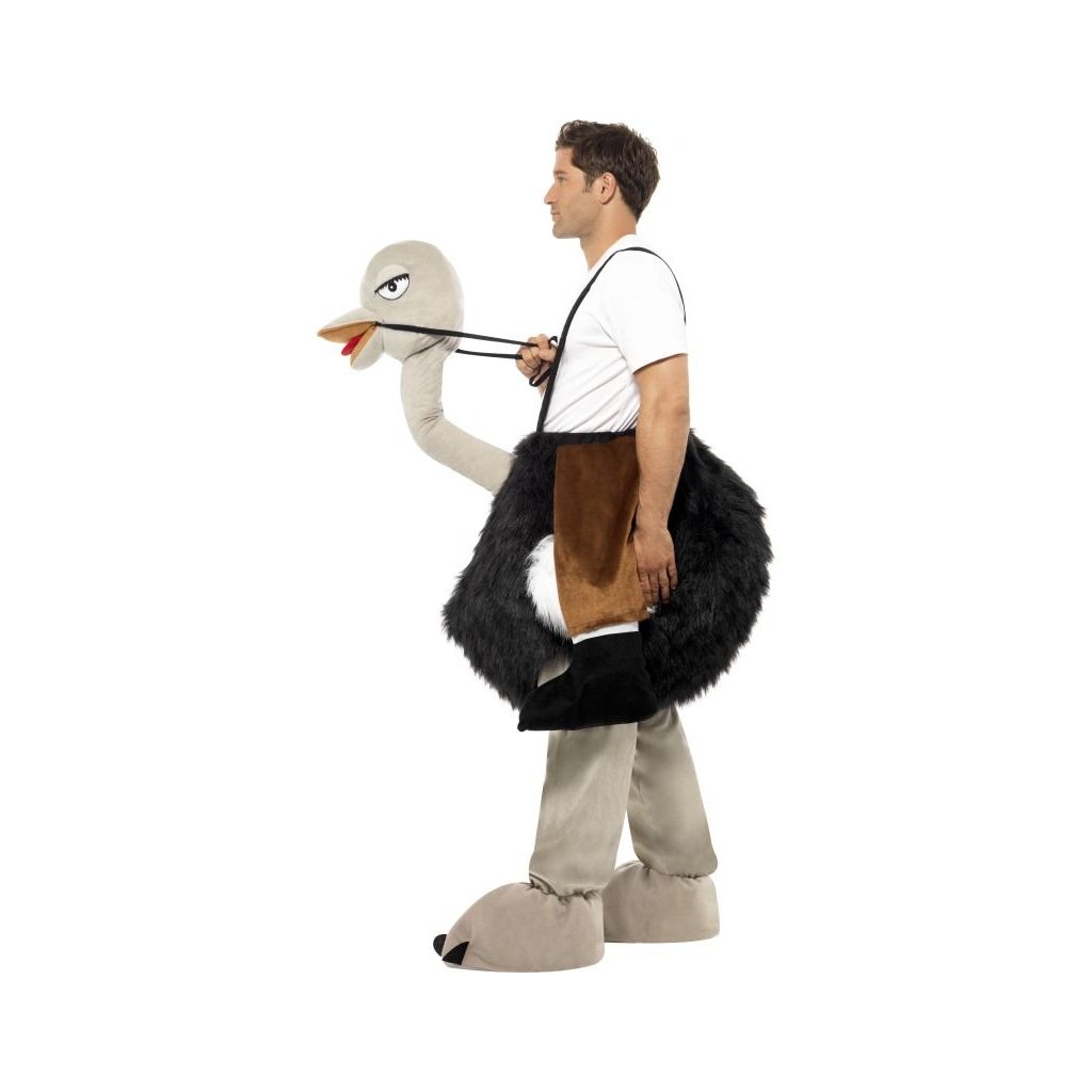 Kostým pštrosa stačí navléknout jako kalhoty. Celý kostým drží kšandy, které jsou přišité ke kostýmu.