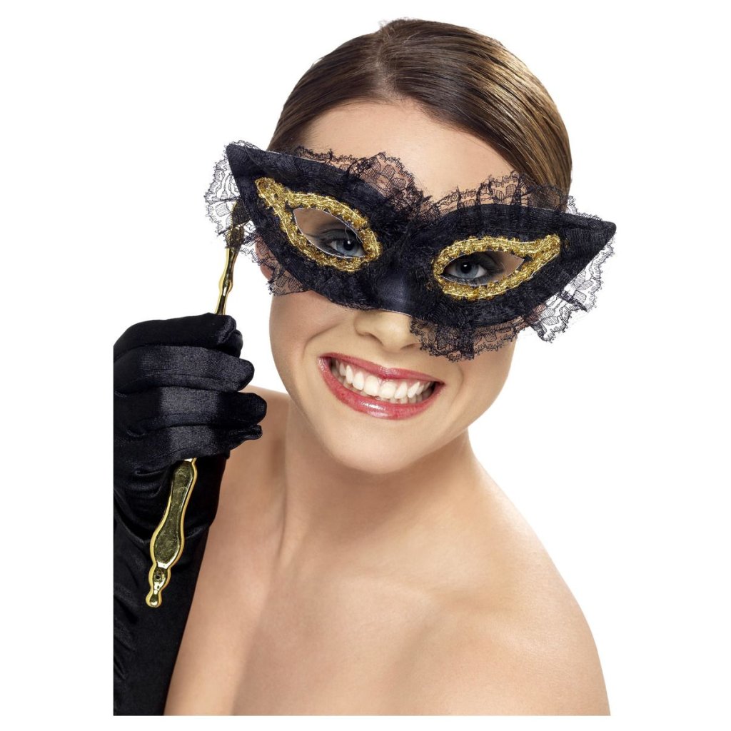 • škraboška je potažená černou látkou, zdobená krajkou a zlatou stužkou
