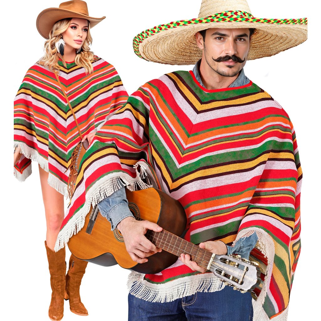 Sombrero a pončo jsou typické doplňky pro kostým na mexickou párty. Proužkované pončo vám navíc poskytne pohodlí a případně vás zahřeje.