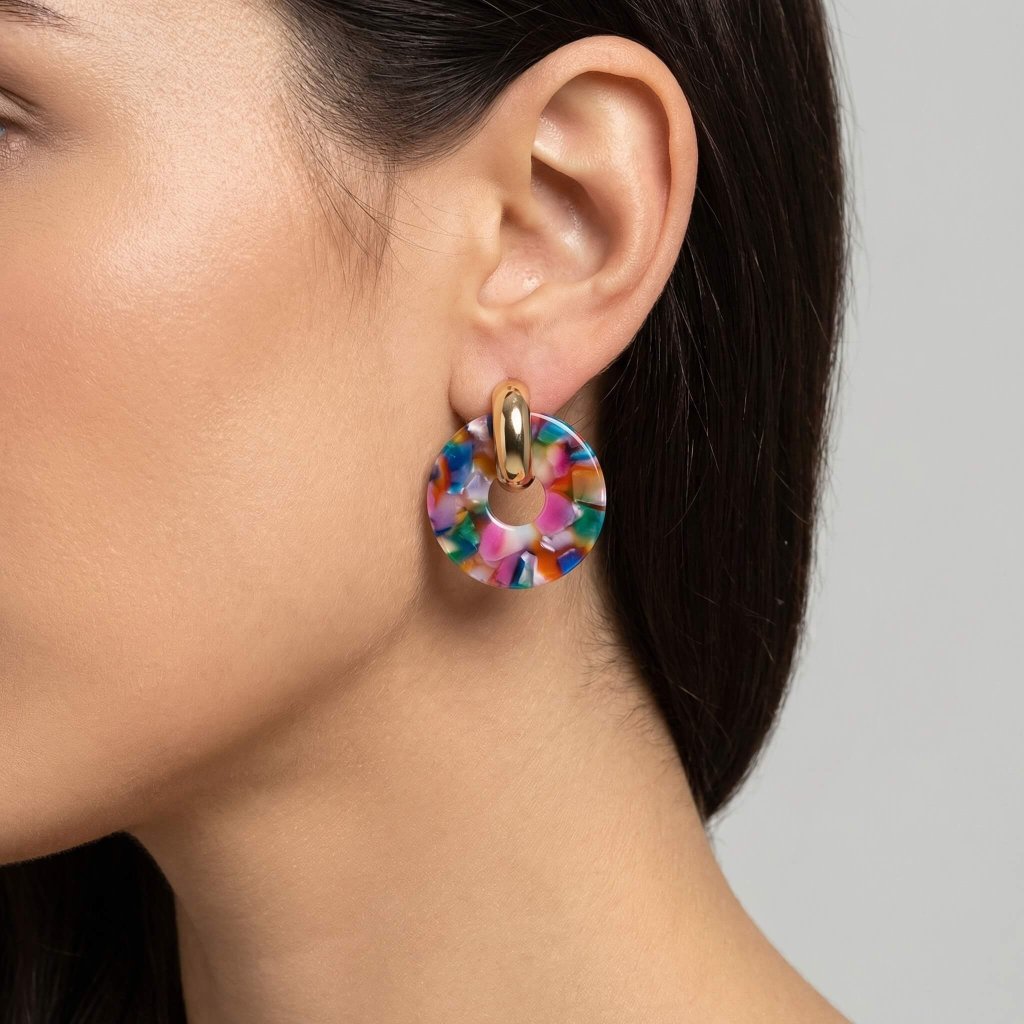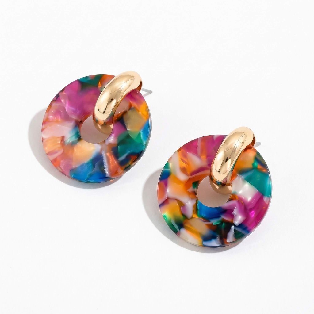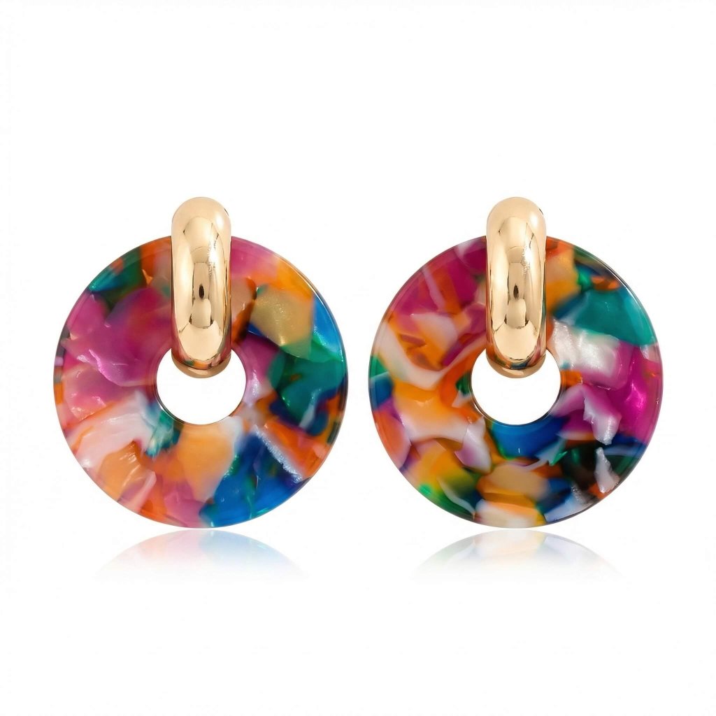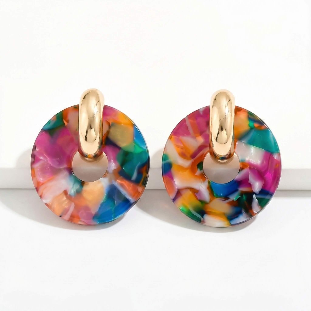 Výrazné barevné náušnice s mramorovým efektem a zlatým detailem jsou perfektní doplněk ke kostýmu 80. let i dalším retro outfitům.