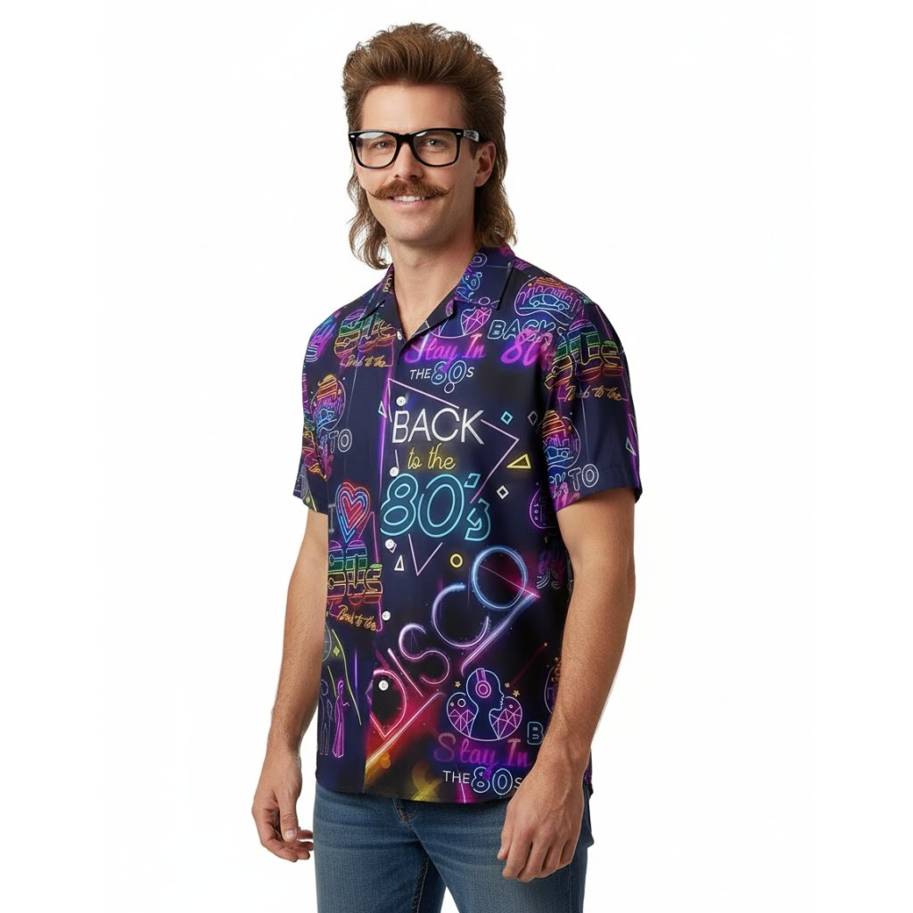 Fialová retro košile s barevnými vzory je nejen vizuálně atraktivní, ale také pohodlná. Skvěle ji využijete jako součást kostýmu na retro párty. Je jen na vás, zda ji elegantně zapnete nebo necháte ležérně rozevlátou.