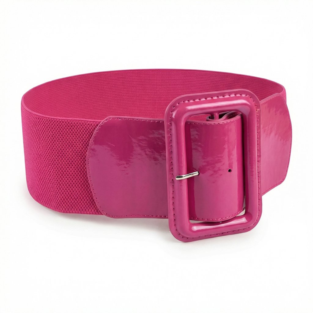 Výrazný široký elastický pásek s lesklou sponou v sytě růžové barvě je nepřehlédnutelný doplněk pro retro styling.