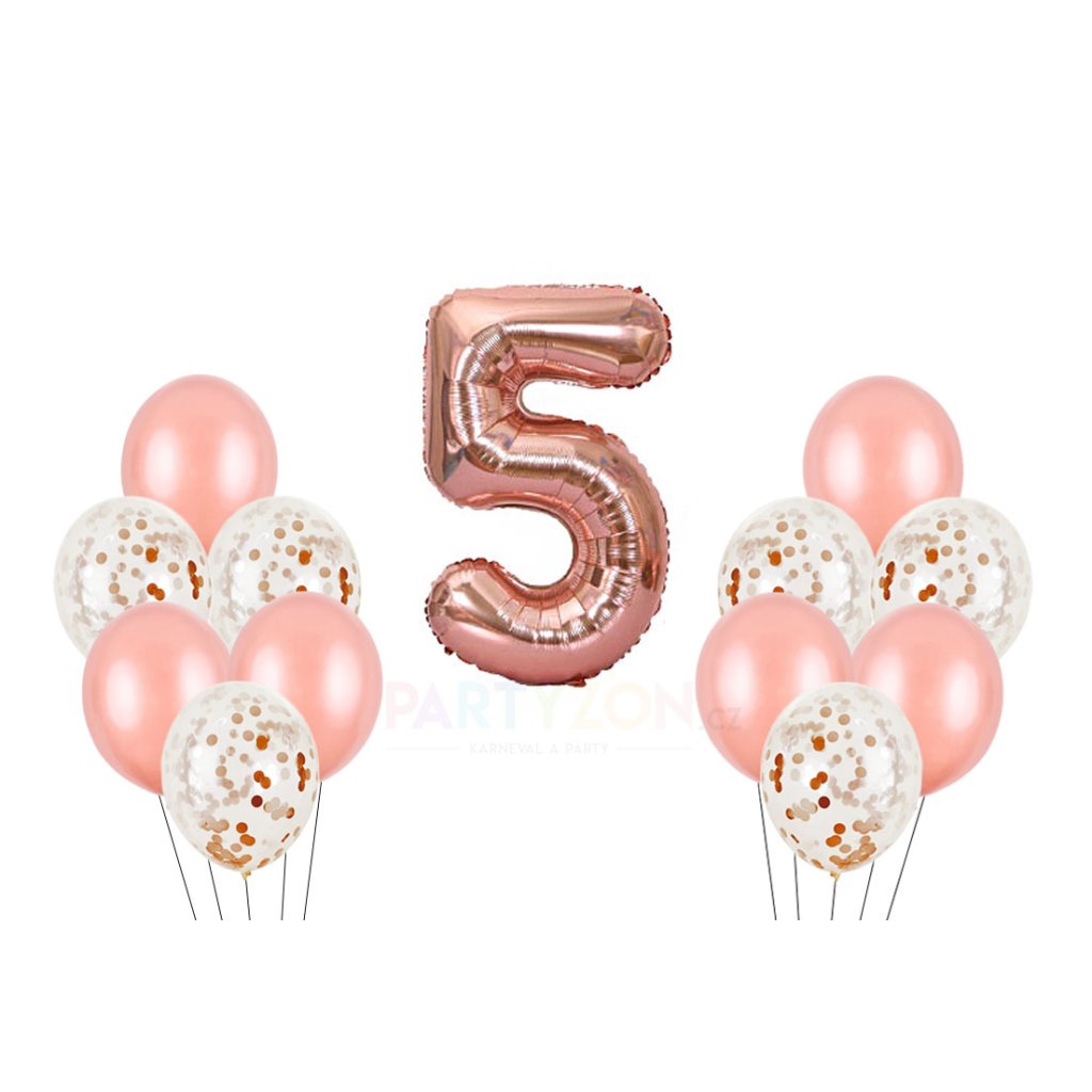 Balení obsahuje krásné průhledné balónky, které jsou plněné konfetami a růžové latexové balónky. Součástí je i velký foliový balónek s číslem 5.