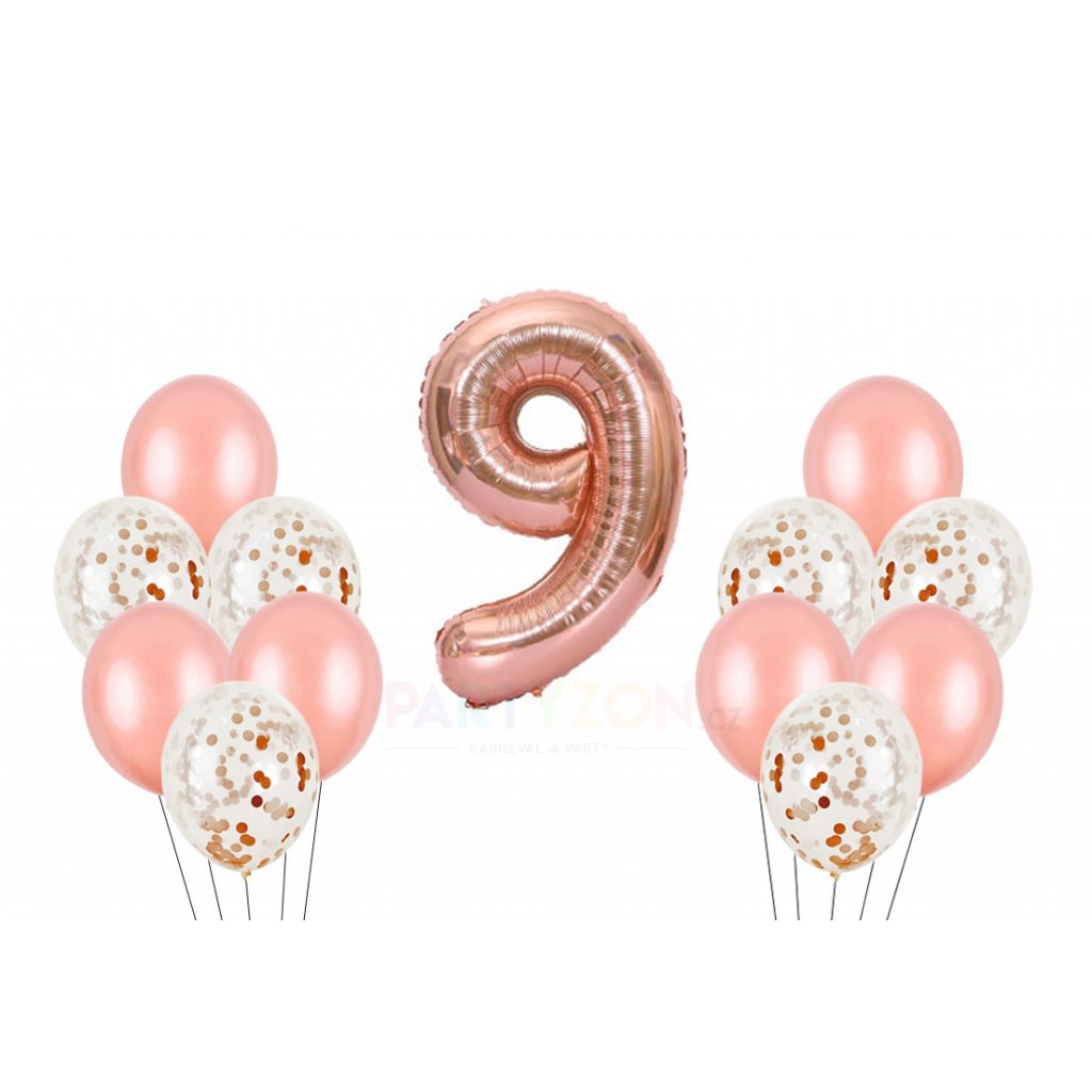 Balení obsahuje krásné transparentní balónky, které jsou plněné konfetami a růžové latexové balónky. Součástí je i velký foliový balónek s číslem 9.