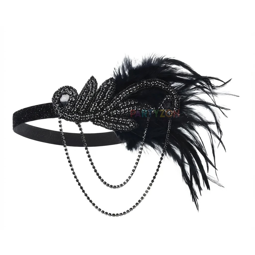 Podtrhněte svou ženskost s touto ikonickou retro čelenkou, která kombinuje dramatické černé peří a jemně padající řetízky.