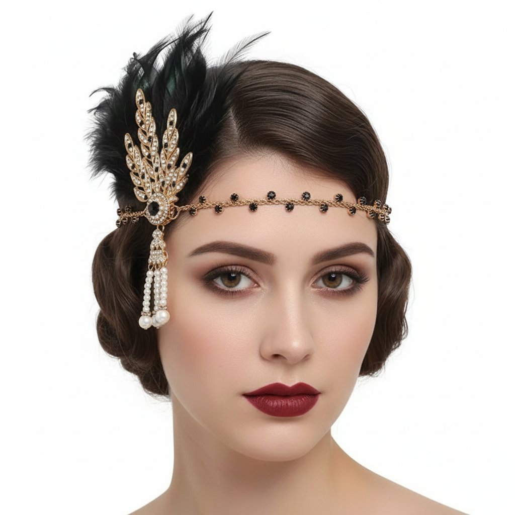Elegantní čelenka ve stylu 20. let s peřím, zlatou ozdobou a perličkami je dokonalý doplněk k flapper kostýmu. Skvěle se hodí na retro párty, Gatsby večírek i karneval.